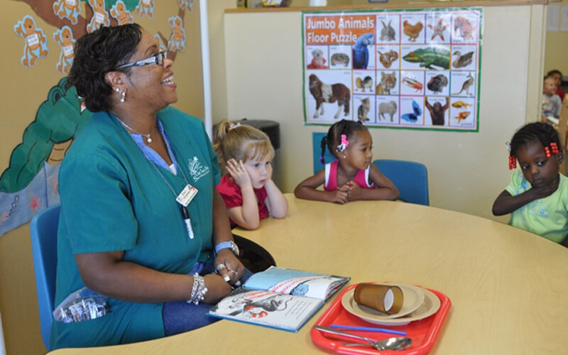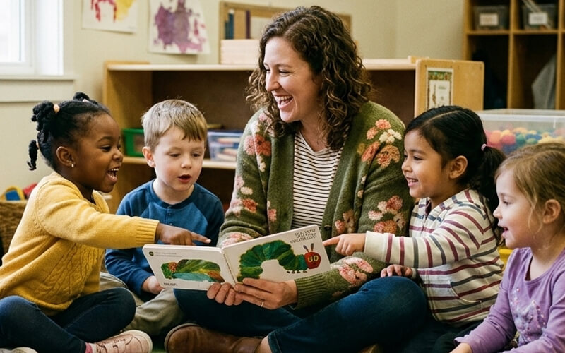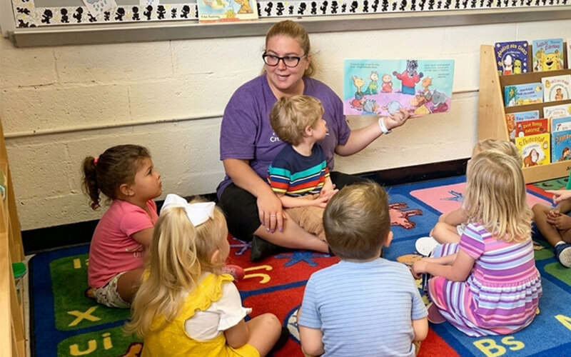 Teachers often sit on the carpet with children during circle time to read stories, sing songs, and introduce study topics. This teacher-guided group time supports language and social skills.