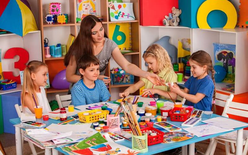 Creative Curriculum classrooms include art centers where children explore materials like paper, paint, and markers while teachers guide and ask questions to extend learning.