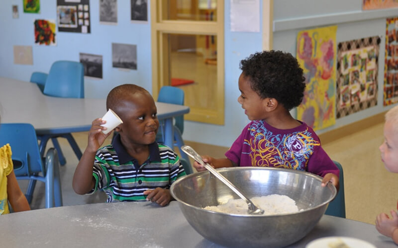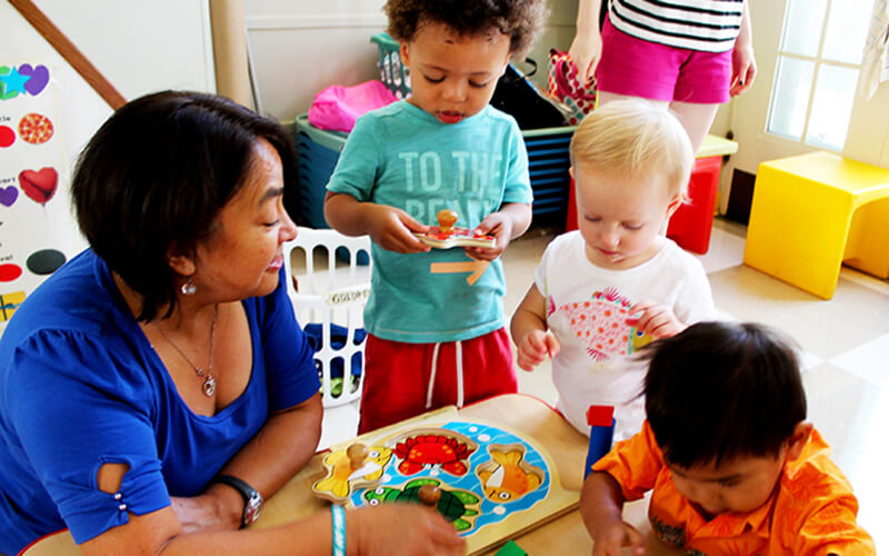 Teachers support children as they explore puzzles, manipulatives, and discovery activities. The curriculum emphasizes hands-on investigation and play-based learning.